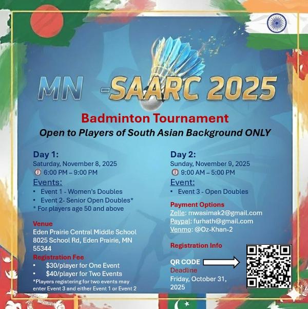 We're bringing the heat with a high-energy doubles tournament for players of South Asian origin from Afghanistan, Bangladesh, India, Pakistan, Nepal, Sri Lanka, Bhutan, & Maldives . Whether you're a seasoned player or a year-round player from different clubs in Minnesota, this is the platform to be recognized and help grow the badminton community.