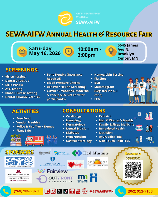 Join us for our free Annual Health & Resource Fair on May 16 2026 from 10am to 3pm at SEWA-AIFW. Take advantage of our free medical screenings, consultations and more!