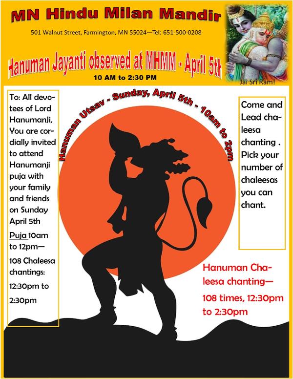 Your cordially invited to join the Milan Mandir pariwar to celebrate Hanumanji Utsav on Sunday, April 5th, 10am to 12:30pm, Hanumanji Puja, Hanuman Chaleesa chanting 108 X  starting 12:30 PM to 2:30 PM. Please help to share this invitation and attached flyer with your friends and all Hanumanji bhaktas.