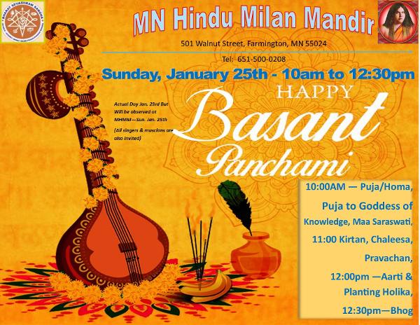 You are cordially invited to participate in Vasant Panchami, Saraswati Puja on Sunday, January 25th at Milan Mandir. 10am to 12:30pm. Let's come and usher in the warm season Spring.