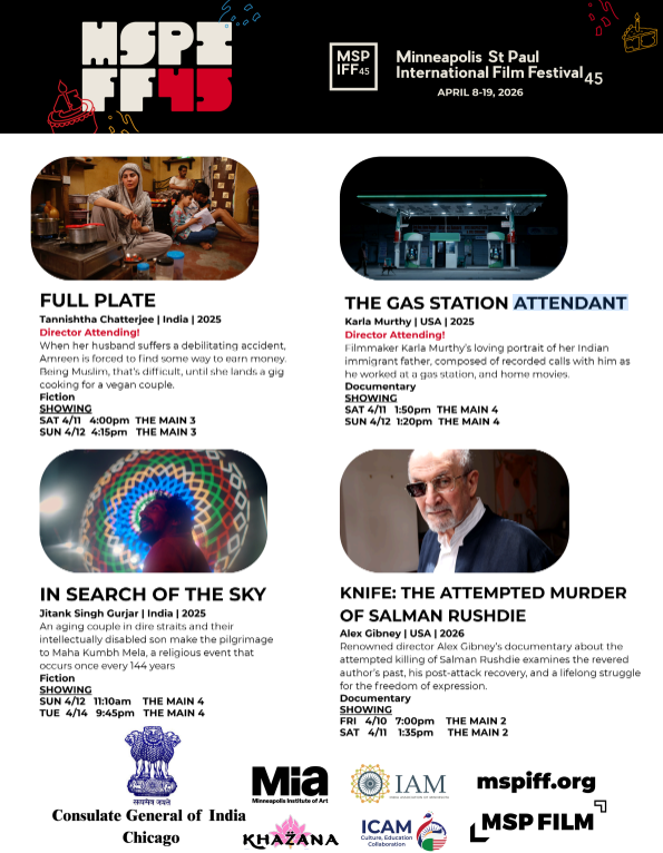 MSPIFF, aka the Minneapolis St. Paul International Film Festival, returns April 8-19, 2026 to celebrate its 45th anniversary with another awesome lineup of over 200 films from around the world, including Indian films (see below), plus parties, panels, visiting filmmakers, and special guests galore. Films will be shown at The Main, Minneapolis Institute of Art (Mia), Capri Theater in North Minneapolis, Landmark Center in St. Paul, Edina Mann Theatre, Rochester, MN. As the largest annual celebration of international cinema in the region, MSPIFF45 promises to be its biggest festival yet!