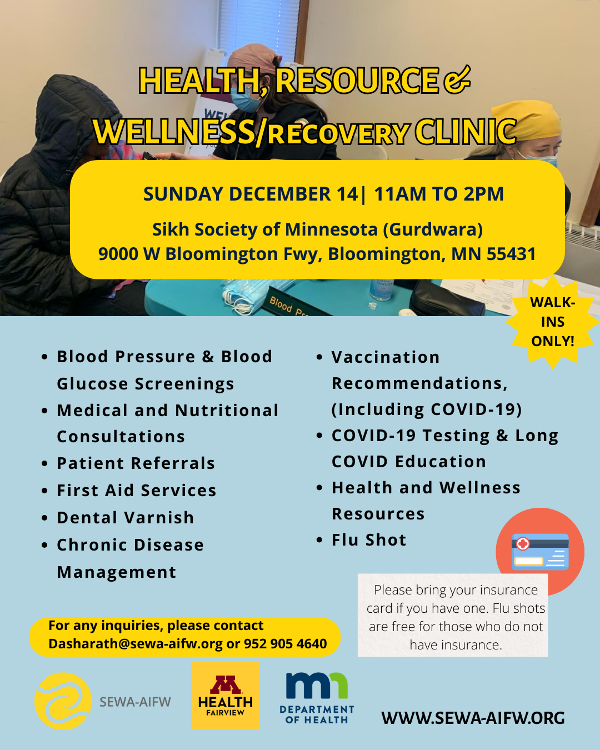 Join us for a free health and resource clinic on Saturday, December 14th, from 11 a.m. to 2 p.m. at the Sikh Society of Minnesota (Gurdwara), 9000 W Bloomington Fwy, Bloomington, MN 55431.