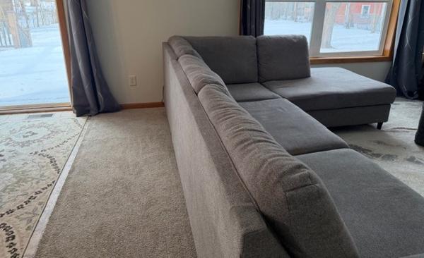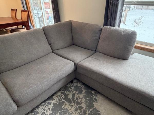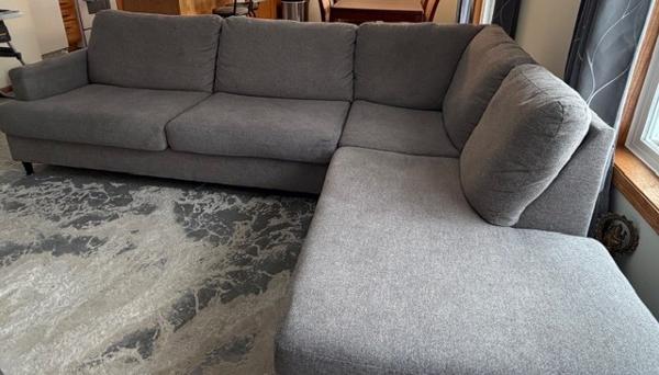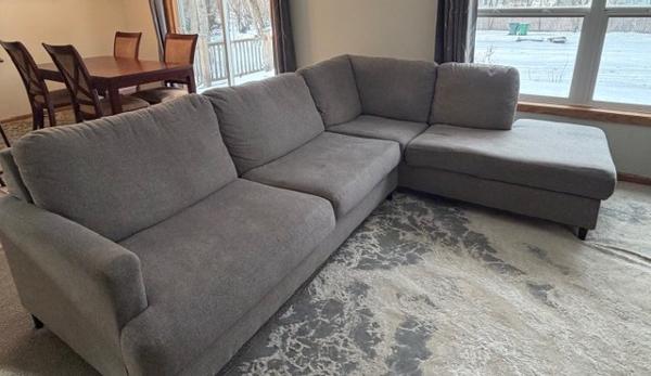 Spacious gray sectional couch in great condition. Very comfortable and perfect for living rooms, family rooms, or basements. Neutral gray color matches easily with any décor. Condition: ? Very good condition ? Clean, no tears, light stain ? Smoke-free and pet-free home Details: Sectional sofa (L-shaped) Color: Gray Seats multiple people comfortably Sturdy frame and supportive cushions