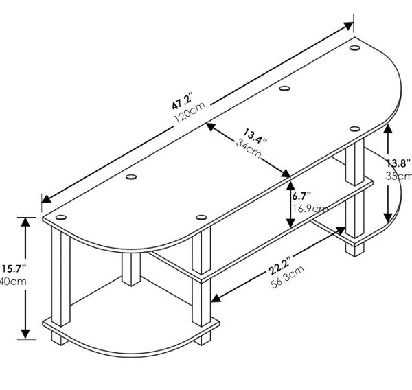 Gray wood and black metal 3-tier corner TV stand. Top shelf is 47.2 inches wide and 13.4 inches deep. Has holes for cable management. Middle shelf is 6.7 inches below top shelf and 22.2 inches wide. Bottom shelf is 15.7 inches high and 22.2 inches wide. Sturdy and great for holding TV and media devices.
